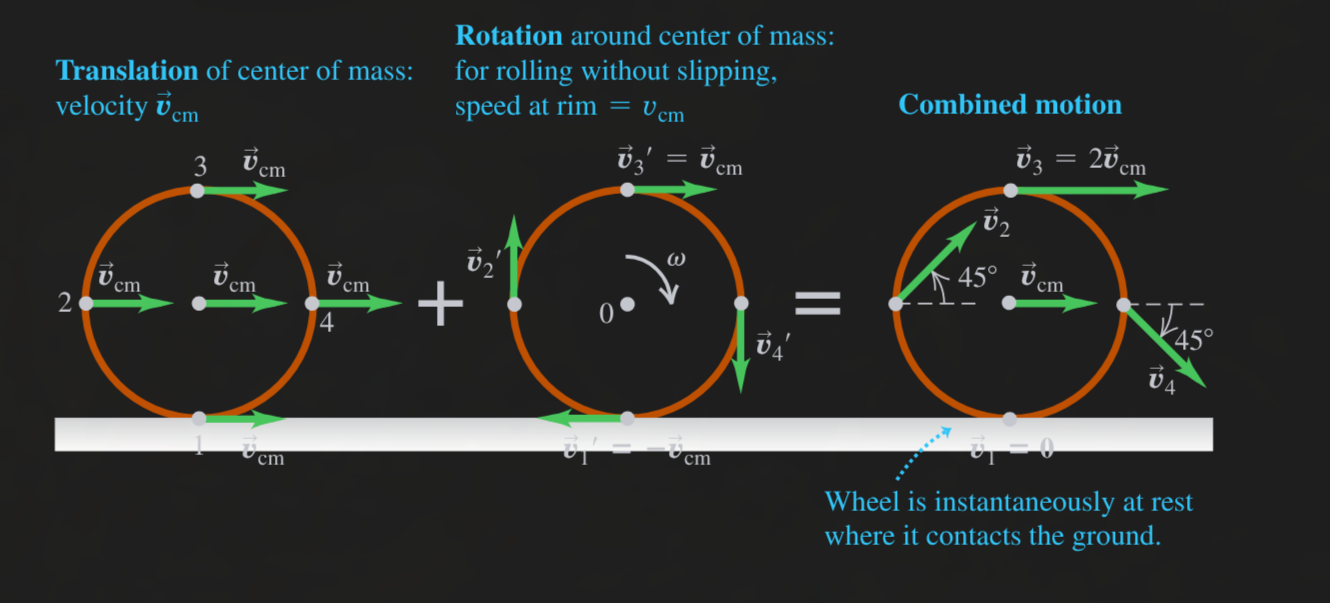 Bilden visar rörelsen hos ett rullande hjul är summan av den translationella rörelsen för masscentrum och hjulets rotationsrörelse runt masscentrum.