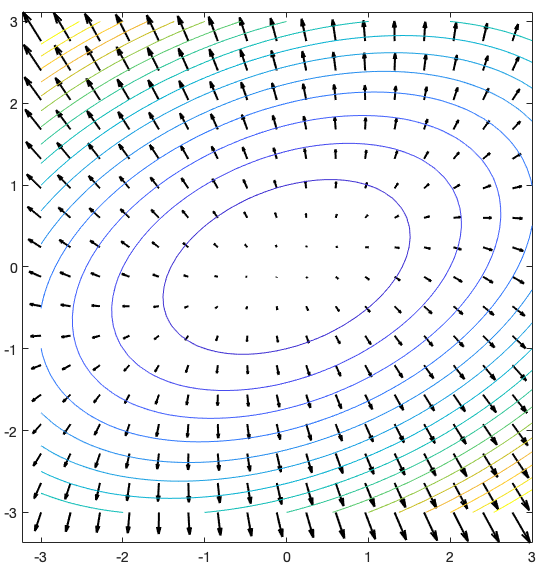 Kom ihåg: Gradienten pekar åt det brattigast uppför-hållet. Nivåkurvorna (höjdkurvorna på en karta) är alltid gradienten. Tätt liggande nivåkurvor = stor = brant lutning.